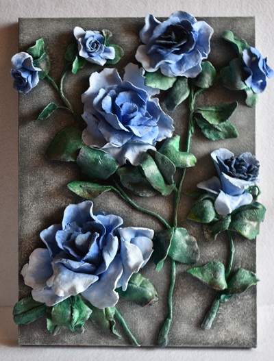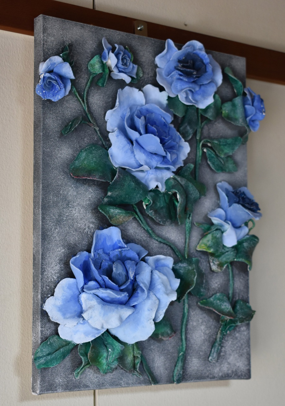 壁掛け立体装飾の薔薇・・カンバスに紙粘土仕上げ、サイズ横幅24cm×縦33cm ご覧のように壁掛けとして室内装飾品としてお使いいただけます